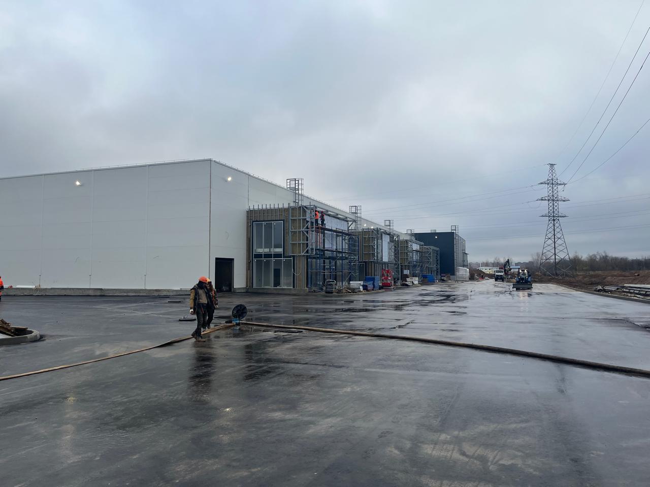 Продолжаются работы по фасадам, внутриплощадочным сетям, кровле, отделке административных помещений, монтажу инженерных коммуникаций и полов в складской зоне. Начались работы по благоустройству территории.